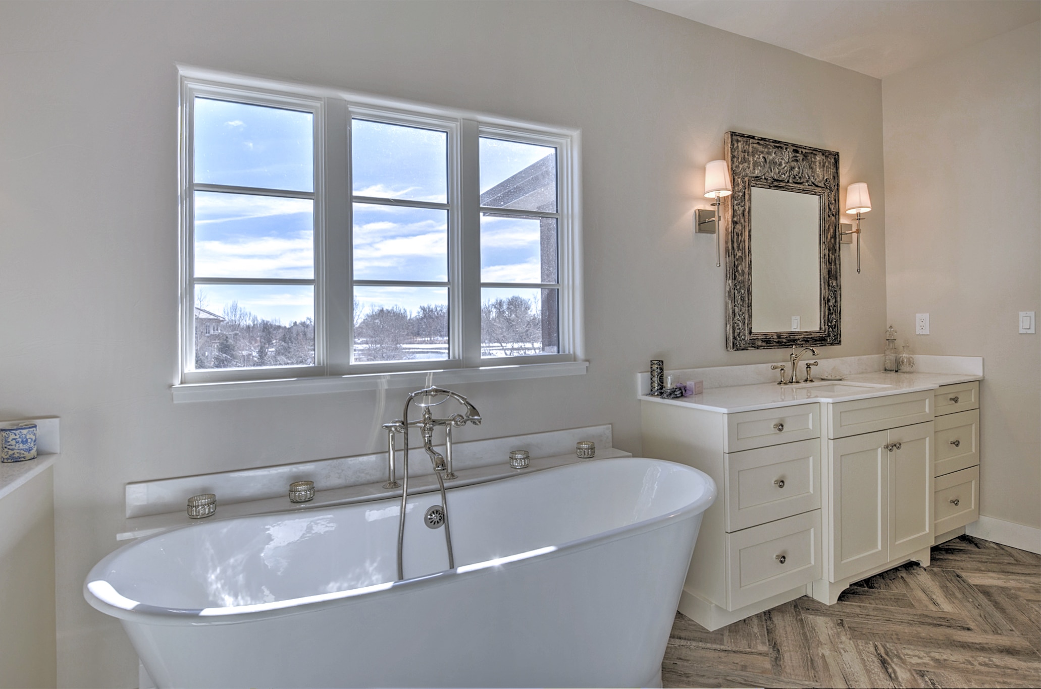 Two of this home’s more unique features had even more unique sources. The basement home office has a wood floor made from an old semi-truck trailer floor that we distressed and installed by hand. The result is a beautiful floor that is also protected from water or any other challenges inherent to a floor covering on concrete near a lake. Meanwhile, the master bath upstairs has tiles designed by the interior designer-turned-homeowner. All we had to do was install them.